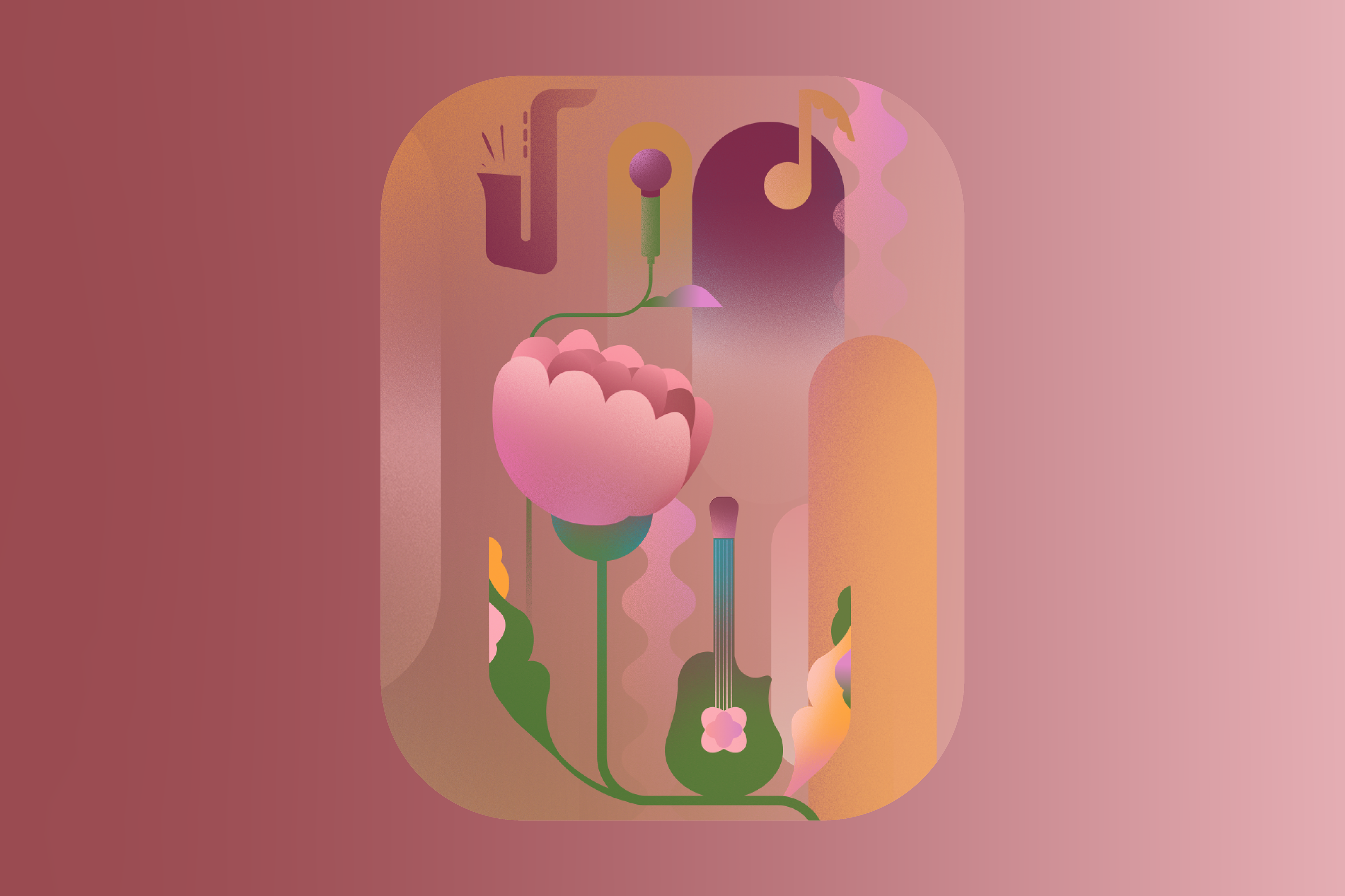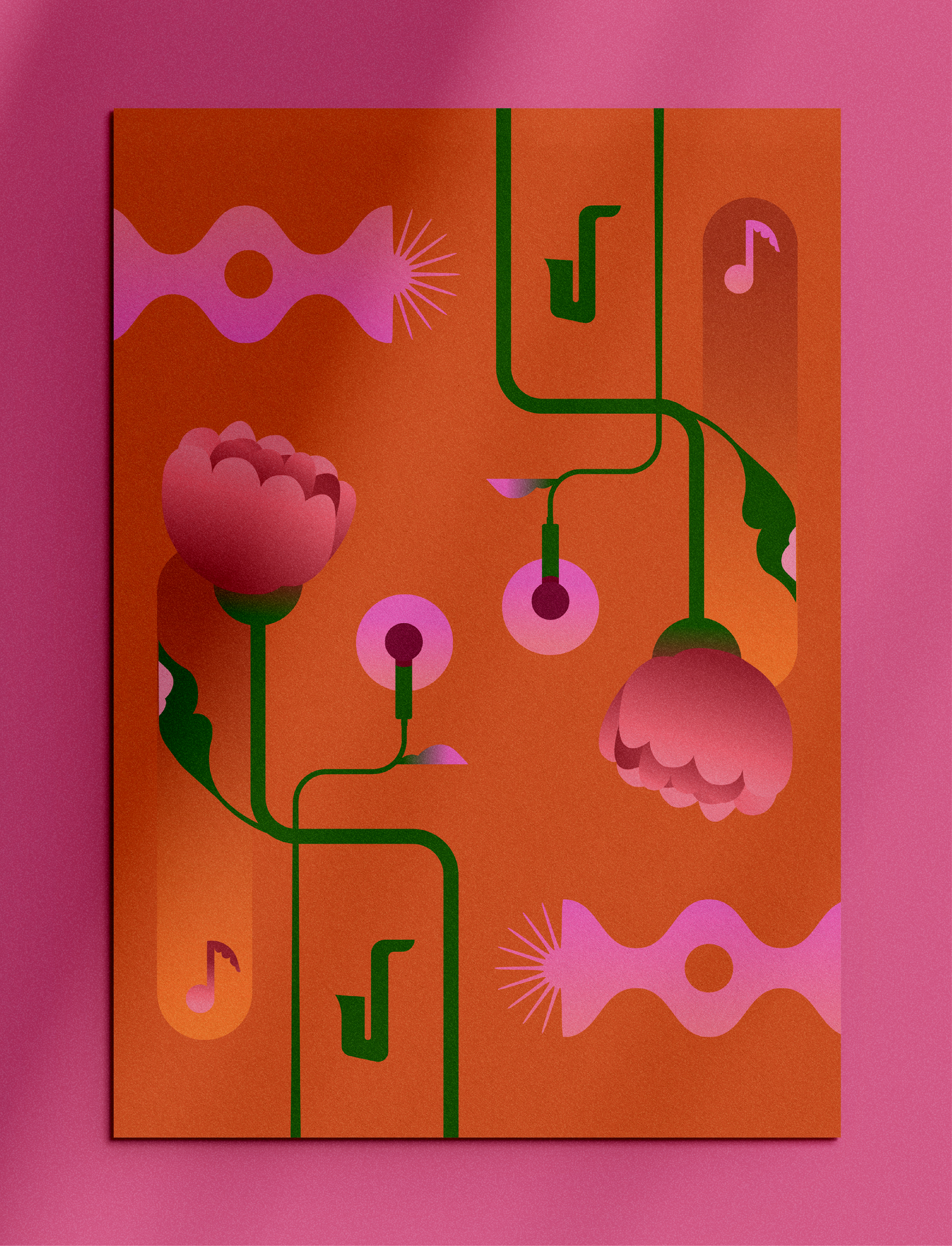 A partir disso, a ilustração se estabeleceu como eixo central, dando forma a um universo onde elementos da natureza se fundem a instrumentos musicais. Formas orgânicas emergem como metáforas de expressão, crescimento e presença.